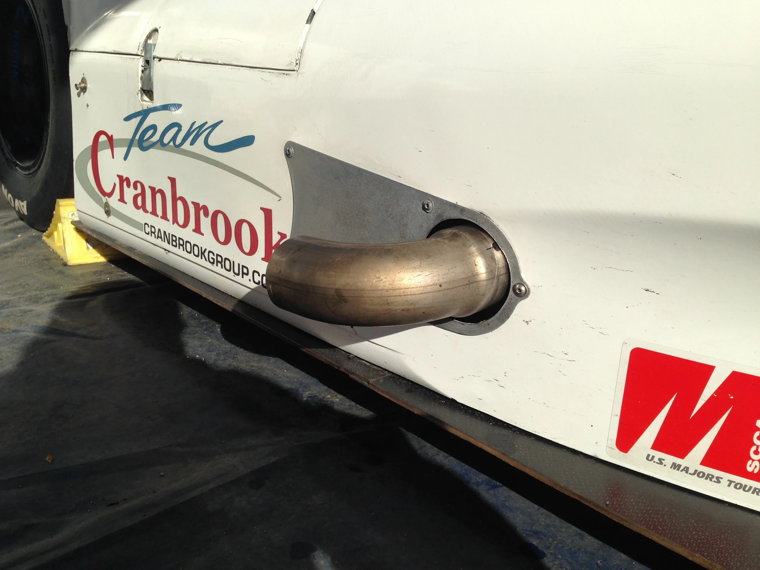 After running multiple weekends at Laguna WITHOUT running afoul of the sound limitations, today we got bit. We were black flagged after only one hot lap and forced to sit out the rest of the session. It seems so bogus given my car is one of the quietest of all the cars here at Laguna regardless of class. The only logical explanation is some how we are getting a weird harmonic with my exhaust aimed directly at the sound meter station. I drove to a local muffler shop and scavenged through his discard pile and came up with the turn out piece shown below. Jason was able to modify it to work and we shall see if we are ok tomorrow. Sound limit here is 103 db and sound Nazi says I was 106 today after never having been near that before. Hopefully all better tomorrow. Worst part is we lost two positions to others who jumped ahead of my yesterday's Q1 time...now sitting 4th. Car felt great in the one hot lap I got and it was a 123.9 so was expecting a good session. Just need to be able to have 3 or 4 clean laps in a row to really go fast. The other cars were able to get that string of laps once I was forced in to the pits.